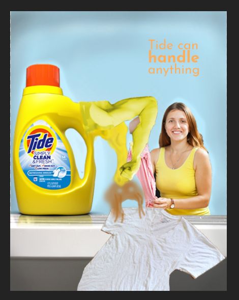 I started from 12 rough ideas, to 6, top 3, and then 1 final linear as the best idea and my plan of execution to showcase the idea. The idea shows the “Tide” bottle pull off a stain from a once dirty shirt with its handle as a strong arm. The execution is the bottle, using its handles as if its a strong to remove the stain, showing how powerful it is to be able to perform heavy duty work with relative ease, producing great results. There was the target audience initially in the drawing, smiling in approval of what it can do, but from a feedback, the person did not needed to be in it, during the Photoshop mock up, with more focus on the product, and its strong arm on a table, with an orange gradient background, using the dodge tool to make the light shining down on it, and the burn tool to darken the edges that contrasts the foreground to background. The idea, took quite a bit of trial and error to get a better design, based on feedback, and looking at other tide ads, and other kinds of advertisement.